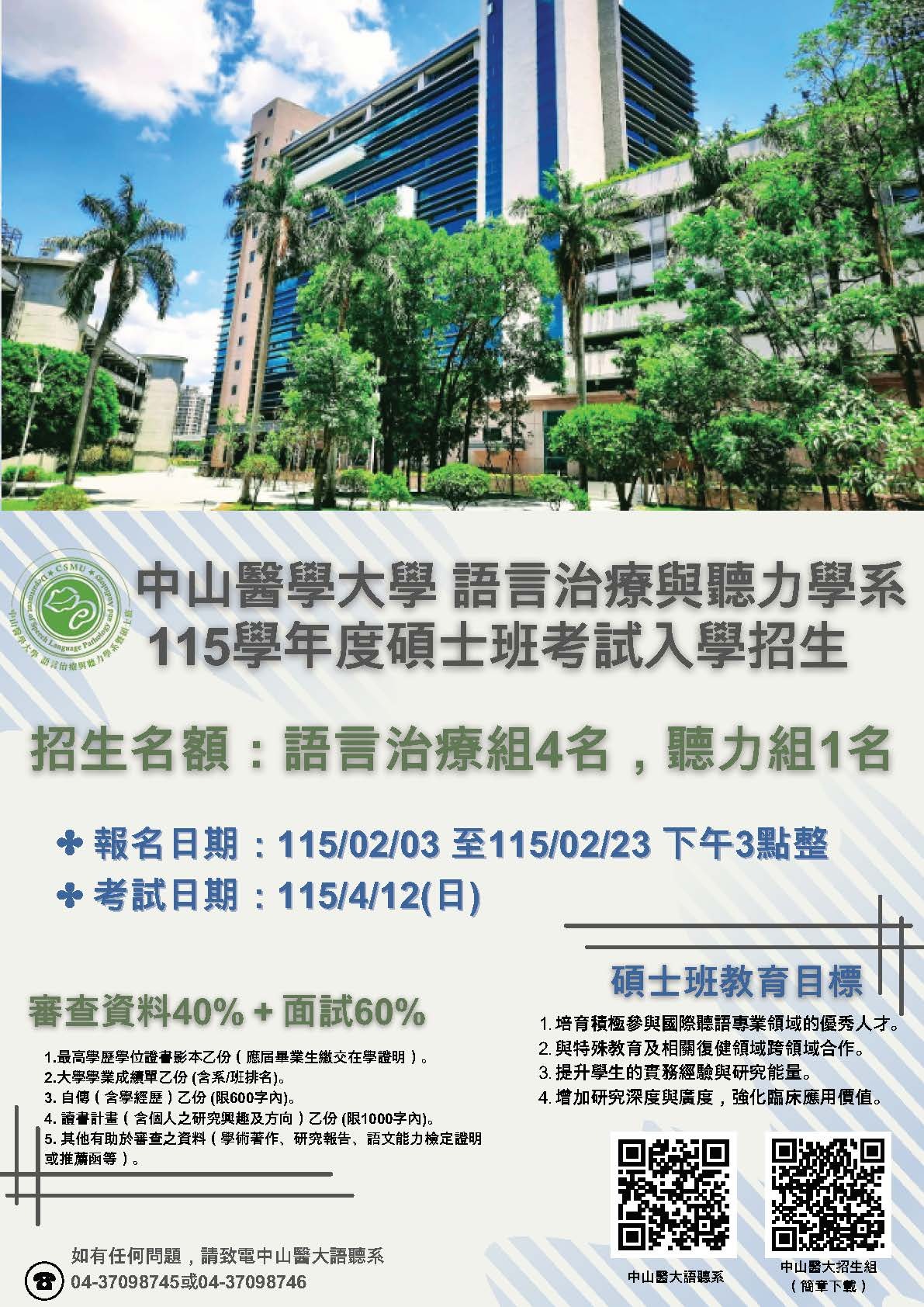 115學年度 中山醫學大學 語言治療與聽力學系碩士班考試入學簡章,歡迎報考