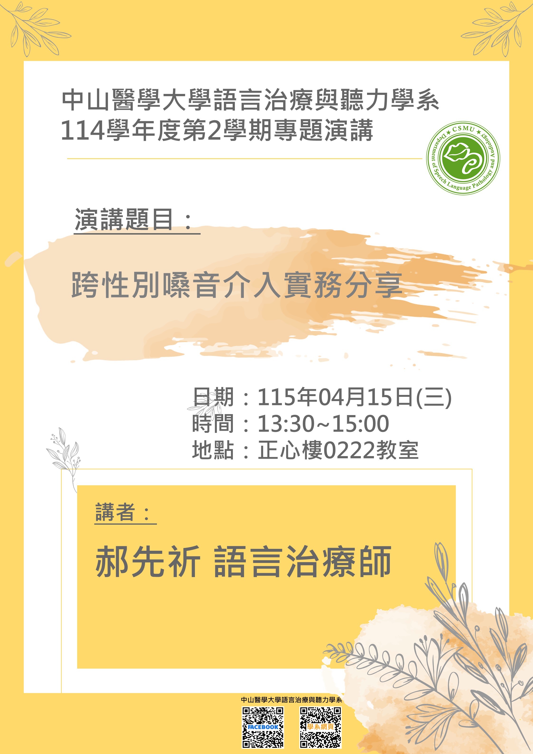 【專題演講】115/04/15(三)郝先祈語言治療師專題演講