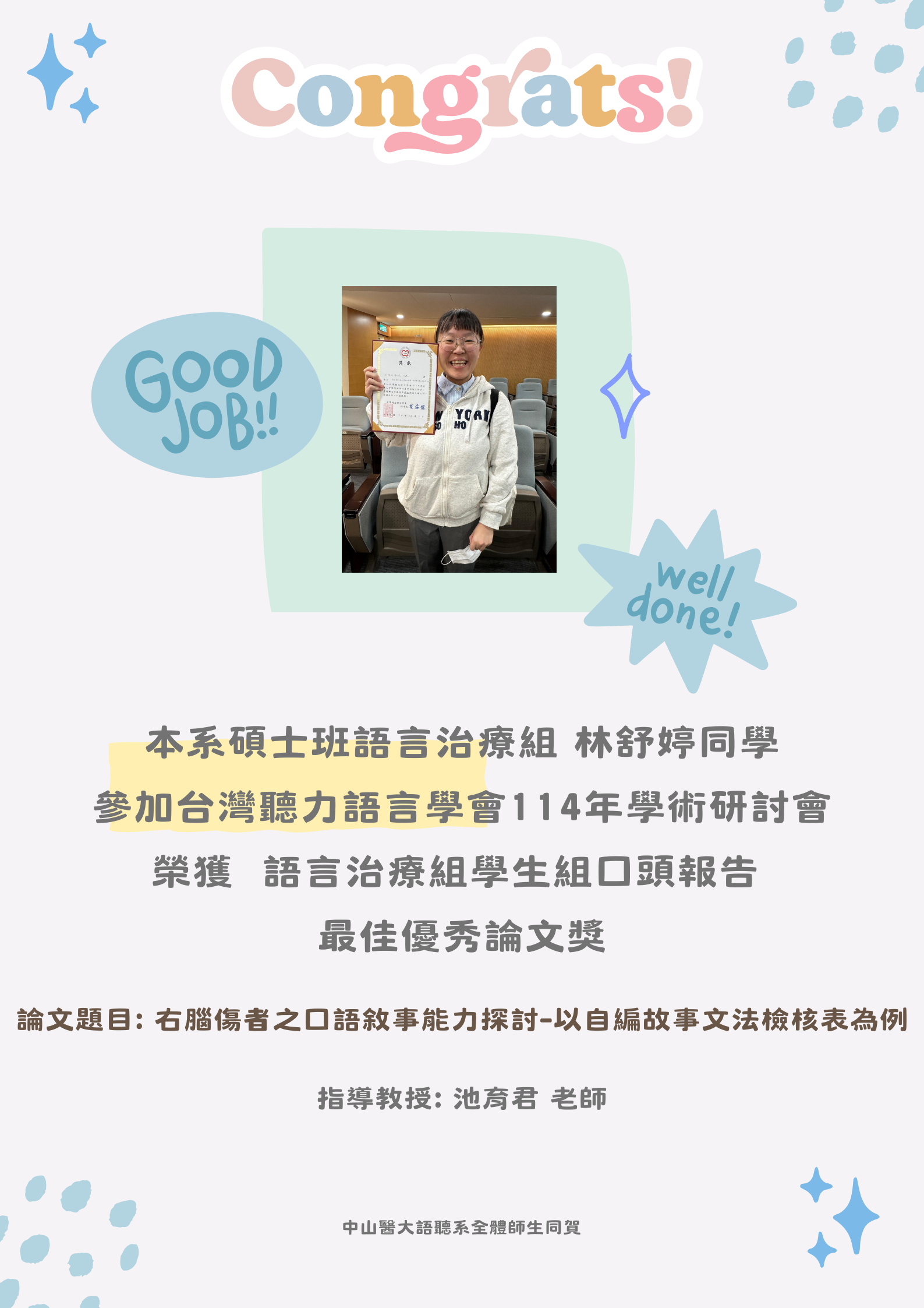【恭喜】本系碩士班語言治療組 林舒婷同學及指導教授池育君副教授參加台灣聽力語言學會114年度學術研討會榮獲語言治療組學生組口頭報告 最佳優秀論文獎